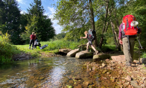 Auf den Wandertouren streifen wir auf kleinen Pfaden umher oder gehen unserer Neugierde nach querfeldein, folgen Wildwechseln, Bachläufen und Hügelketten. Unterwegs lernen wir, uns mit einfachen Mitteln in der Natur zurechtzufinden. Dies geschieht im Tun, während wir draußen kochen, täglich frisches Quellwasser finden, uns orientieren und dergleichen mehr.